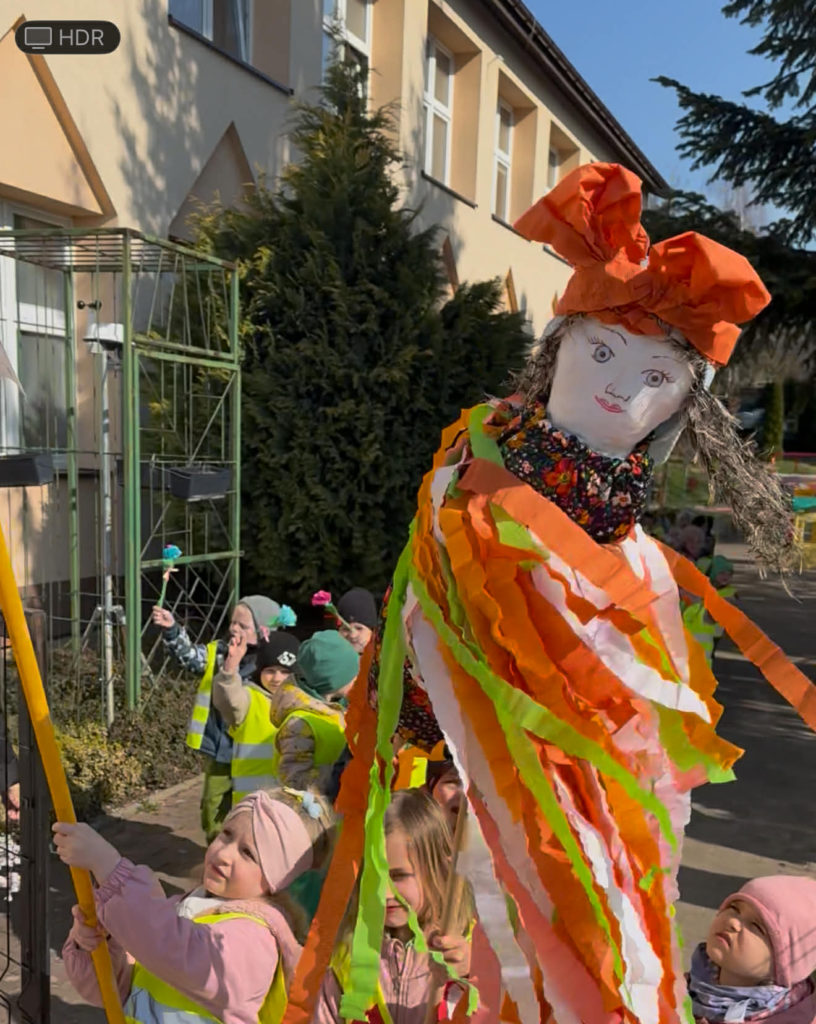 Przedszkolaki z ogromną radością powitały wiosnę. Oglądały teatrzyk w wykonaniu uczniów z klasy Ib, śpiewały wiosenne piosenki oraz pożegnały Marzannę. Podczas wiosennego spaceru dzieci wręczały napotkanym osobom kwiaty, obdarowując ich uśmiechem i życzliwością.